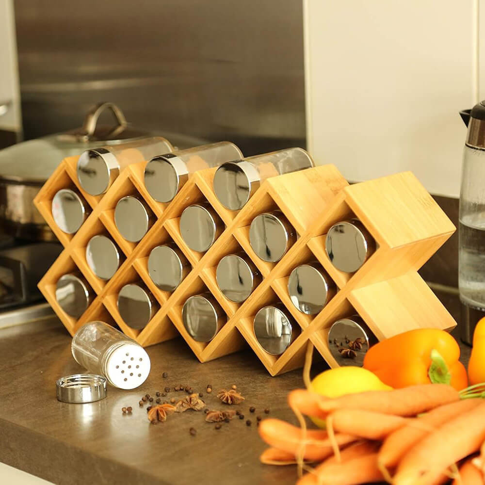 A 18 részes bambusz fűszertartó állvány természetes anyagból készült, modern kialakításával stílusos kiegészítője minden konyhának. A szórófejes fűszertartó üvegek és a helytakarékos konyhai rendszerező megoldás segítenek abban, hogy kedvenc fűszereid mindig kéznél legyenek és rendezetten sorakozzanak.