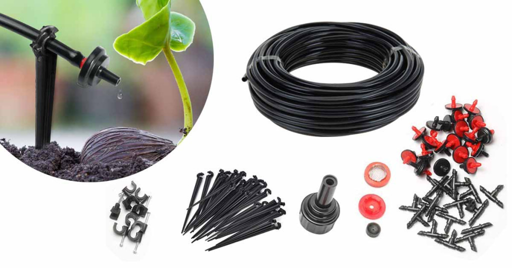 -1 db 23 m tömlő (0,3 cm átmérő)-1 db csapvég áramlásszabályzó szeleppel és szűrővel-15 db „T” alakú csatlakozó-2 db egyenes csatlakozó-10 db végcsepegtető-10 db sorcsepegtető-15 db rögzítő szár- 10 db csőbilincs