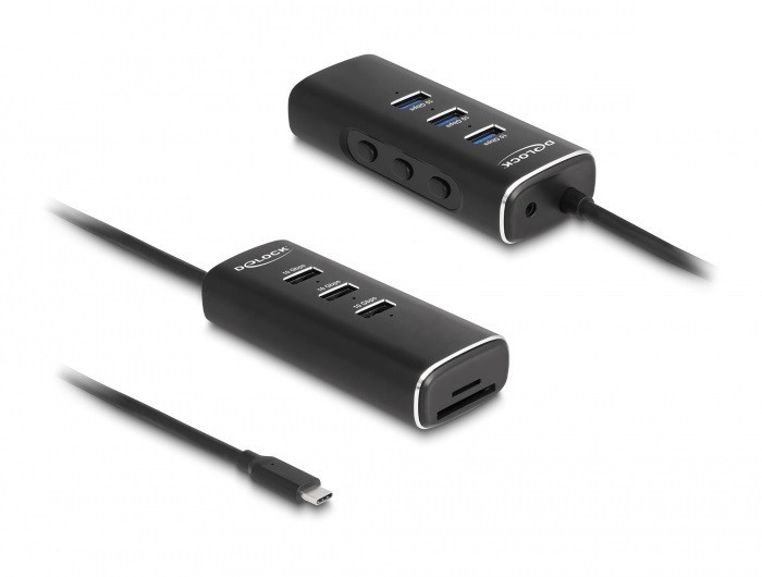 Delock 3 portos USB 10 Gbps hub, SD és Micro-SD kártyaolvasóval USB Type-C , 60 cm hosszú kábellel és portokhoz tartozó kapcsolóval (64234)