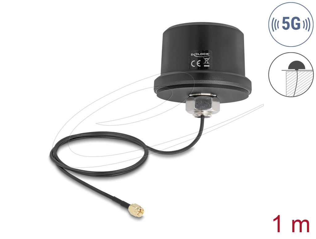 Delock 5G LTE GNSS WiFi 6 antenna SMA-dugó 1,9 - 3,3 dBi irányítatlan, csatlakozókábellel ULA100 1 m, tetőre szerelhető, kültéri, fekete