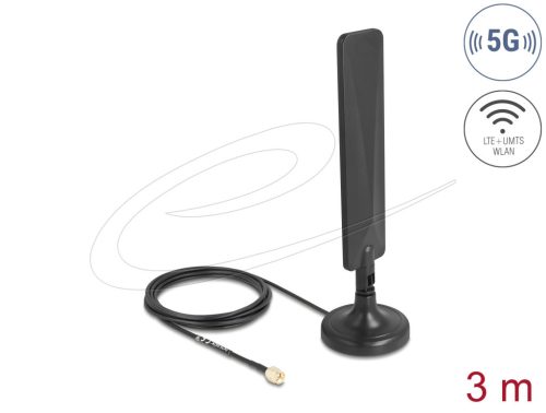 Delock 5G LTE-es antenna SMA-dugó 3 dBi mindenirányú RG-174 csatlakozó kábellel 3 m, billenőcsuklóval és mágneses alappal, fekete színű