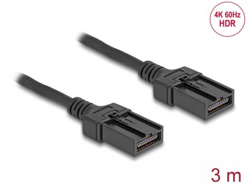 Ez a Delock HDMI-kábel egy HDMI-E autóipari csatlakozóval ellátott kijelző csatlakoztatására szolgál a jármű multimédiás rendszeréhez. Videó és audio jelek továbbítása történik. A HDMI-E csatlakozó reteszelő mechanizmussal rendelkezik, és kifejezetten a járműszektor követelményeihez lett kifejlesztve. Nagyon jól bírja a hőmérséklet-ingadozásokat és a rezgéseket, és megakadályozza a szennyeződés vagy nedvesség bejutását. Leírás Csatlakozók: 1 x HDMI-E Automotive dugó > 1 x HDMI-E Autóipari csatlakozó High Speed ??Automotive HDMI Kábel átmérő: 30 AWG Kábel átmérője: kb. 6 mm Rézvezető Érintkezők aranyozott Csatlakozók aranyozott Kábel kettős árnyékolás Adatátviteli sebesség akár 10,2 Gbps Felbontás akár 3840 x 2160 @ 60 Hz (a rendszertől és a csatlakoztatott hardvertől függően) Támogatja a Dolbyt TrueHD és DTS-HD Master Audio Szín: fekete Hossz csatlakozók: kb. 3 m Rendszerkövetelmények Két szabad HDMI-E csatlakozó A csomag tartalma HDMI-kábel Csomag Cipzáras poli táska Gyártó: Delock