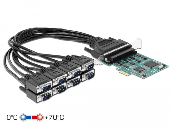 A Delock PCI Express kártya 8 külső soros RS-232 porttal bővíti a számítógépet. Különböző eszközök, úgy mint szkenner, protokoll átalakító vagy IoT elemek, kapcsolhatók ehhez a kártyához. Hűtő ventilátor kivezető kábel A kb. 45 cm hosszú hűtő ventilátor kivezető kábel nagyfokú szabadságot biztosít a 8 db. RS-232 porton és leegyszerűsíti mások mellett számítógépek, eszközök és kiegészítők kezelését. Műszaki adatok Csatlakozó: külső: 1 x DB62 hüvely csatlakozókábel: DB62 dugó > 8 x soros RS-232 DB9 dugó belső: 1 x PCI Express x1, V1.1 Lapkakészlet: SystemBase 16C1058PCI 16C550 UART-kompatibilis Akár 921,6 Kbps sebességű adatátvitel FIFO: 8 x 256 bájt Adatbitek: 5, 6, 7, 8 Szünetek: 1, 1,5, 2 Paritás: páros, páratlan, nincs, jel, tér (köz) Áramlásvezérlés: nincs, hardveres RTS / CTS, szoftveres XON / XOFF Működési hőmérséklet: 0 C ~ 70 C Kábelhosszúság a csatlakozóval együtt: kb. 45 cm Méretek (HxSzxM): kb. 93 x 78 x 12 mm Rendszerkövetelmények Windows 7/7-64/8.1/8.1-64/10/10-64 PC egy szabad PCI Express illesztőhellyel A csomag tartalma PCI Express kártya 1 db. soros csatlakozókábel CD lemez illesztőprogrammal Használati utasítás Csomag Retail Box Gyártó: Delock