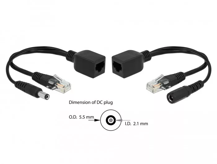 Ezzel a Delock adapter készlettel egy hálózati kábel használható egy 10/100 Mbps Ethernet csatlakozáshoz és egyidejű áramellátáshoz. Ehhez a két adaptert a kábelhez kell csatlakoztatni. Ezután mindkét oldalon egyenáramú aljzat és dugó biztosított egy tápegység csatlakoztatásához. Megjegyzés Az adapter nem használható egyedül; a második adapter mindig szükséges. Műszaki adatok Csatlakozó: Bemenet: 1 x RJ45 dugó 1 x DC 5,5 x 2,1 mm hüvely > 1 x RJ45 hüvely Kimenet: 1 x RJ45 hüvely > 1 x RJ45 dugó 1 x DC 5,5 x 2,1 mm-es csatlakozódugó Teljesítmény: 9 - 57 V, max. 800 mA Tűkiosztás: 1/2, 3/6 adat 4/5(+), 7/8(-) táp Árnyékolatlan (UTP) Kábelhosszúság a csatlakozóval együtt: kb. 21 cm Rendszerkövetelmények Hálózati kábelek A csomag tartalma Passzív PoE adapter készlet Csomag Poly bag Gyártó: Delock Szélesség cm: 15 Hosszúság cm: 21 Magasság cm: 1