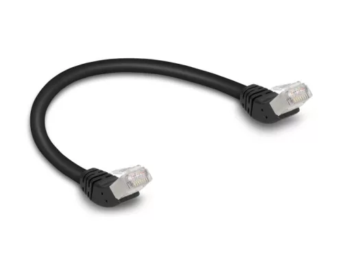 A Delock hálózati kábellel különböző hálózati eszközök kapcsolhatók össze pl. egy hálózati vezérlő egy switch-hez vagy egy patch panelhez. Hajlított csatlakozó fejjel A hajlított csatlakozó lehetővé teszi helytakarékos installációt szűk helyeken eszközök mögött vagy hálózati kabinetekben. Műszaki adatok Csatlakozó: 1 x RJ45 apa 45 fokban felfelé hajló 1 x RJ45 apa 45 fokban felfelé hajló Cat.6A specifikáció Árnyékolt (S/FTP) Sávszélesség: 500 MHz Kábel vastagsága: 26 AWG Kábelátmérő: kb. 6,0 mm Kábelborítás anyaga: LSZH (halogénmentes) Szín: fekete Hosszúság: kb. 0,25 m Rendszerkövetelmények Egy szabad RJ45-csatlakozóhüvely A csomag tartalma Patch kábel Csomag Zárható műanyag tasak Gyártó: Delock