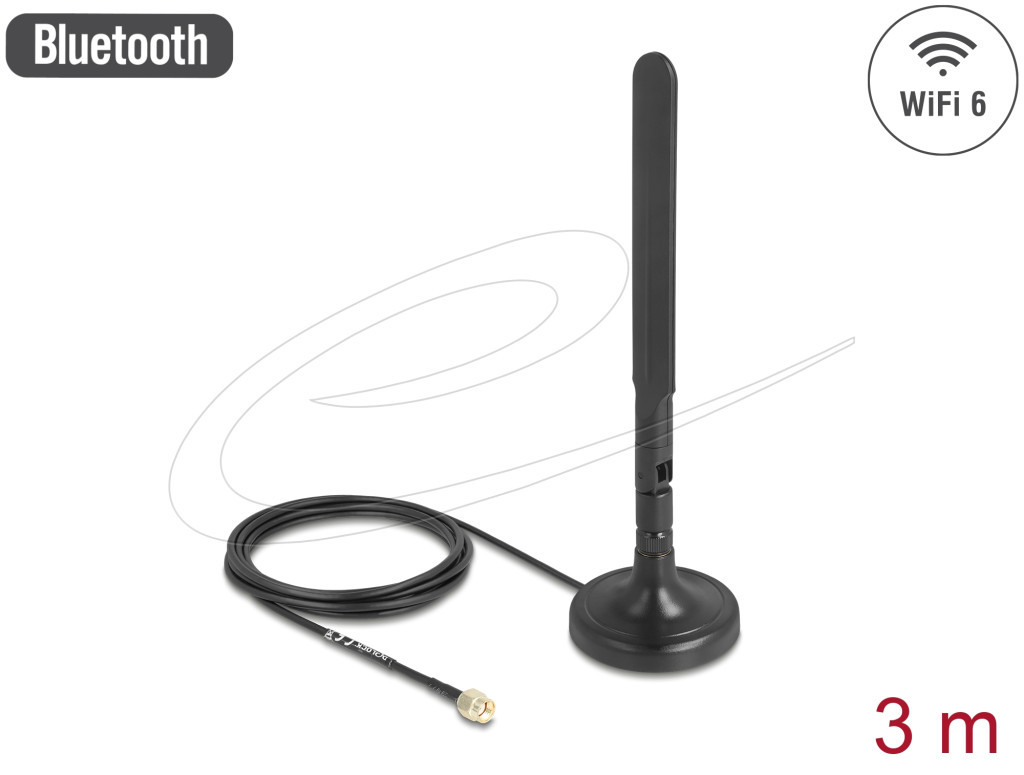 Delock WiFi 6-es antenna RP-SMA-dugó 3 dBi mindenirányú RG-174 csatlakozó kábellel 3 m, billenőcsuklóval és mágneses alappal, fekete színű