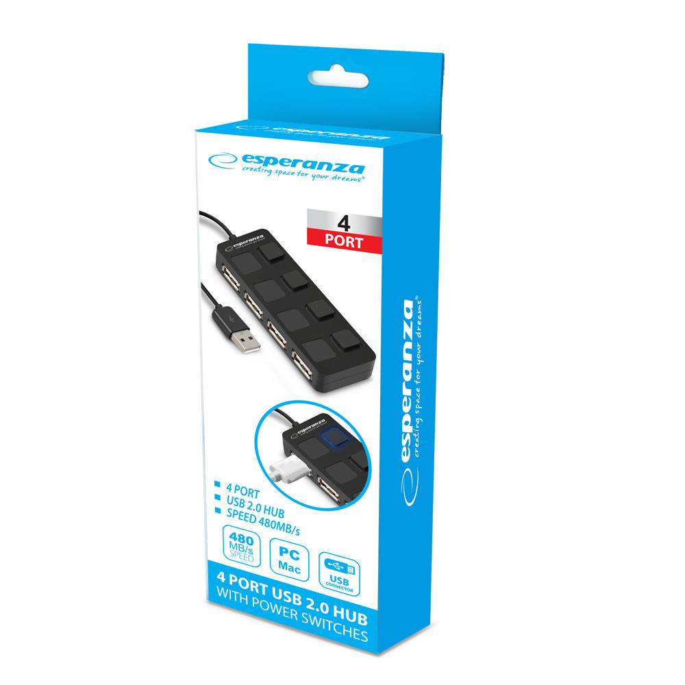 4-port USB 2.0 hub with switches. Ideal for laptop and desktop users.