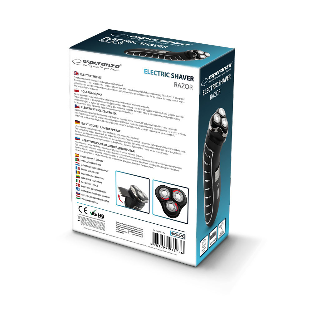Our Esperanza RAZOR shaver is an advanced device that combines modern design with an ergonomic construction, ensuring comfort and precision during shaving. The three movable blades perfectly adapt to the contours of the face, guaranteeing thorough and comfortable shaving. Additionally, the device is equipped with a practical trimmer for styling sideburns and beards, a cleaning brush, and a protective cap that enhances safety during use. Esperanza RAZOR is an essential grooming tool for every man. Its compact size makes it ideal for use at home or during travel.