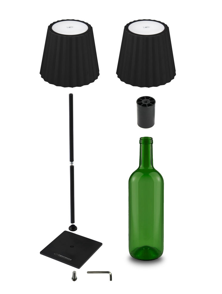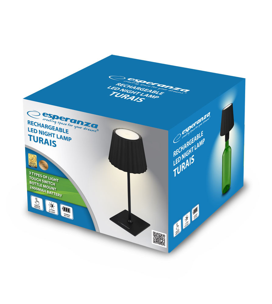 Modern Esperanza TURAIS LED night lamp with versatile functionality. Equipped with a sensitive touch panel, it allows you to choose from three lighting modes tailored to different needs. Thanks to its compact design and a special adapter, it can be mounted on a bottle, enabling creative use in various interiors. The built-in rechargeable battery and USB-C charging port ensure convenient use without the need for a constant power connection.