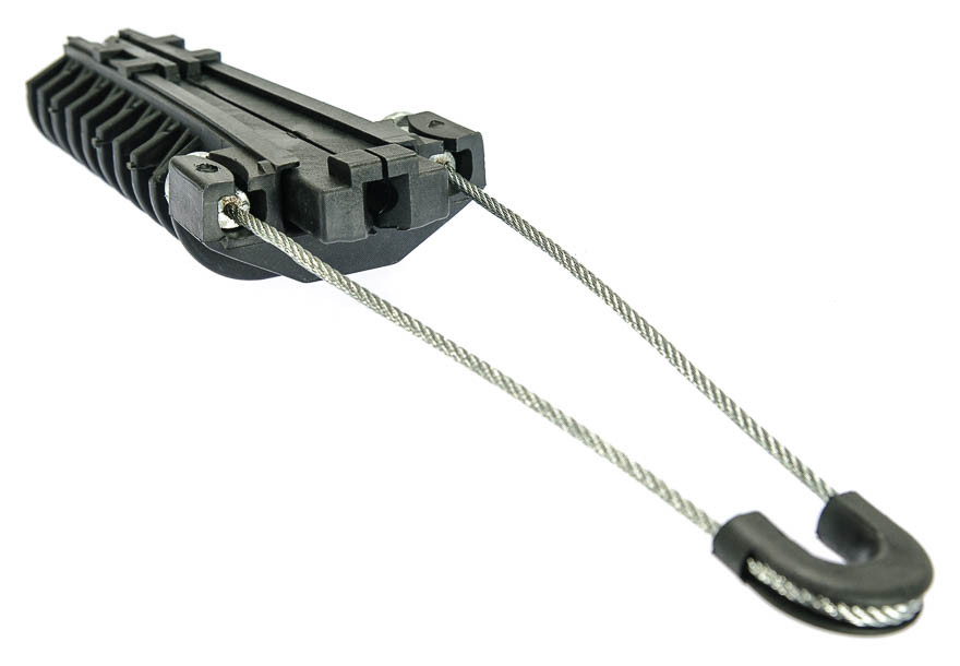 Lashing bracket for suspending fiber optic cables and other round cables with a diameter of 10 to 15 mm.