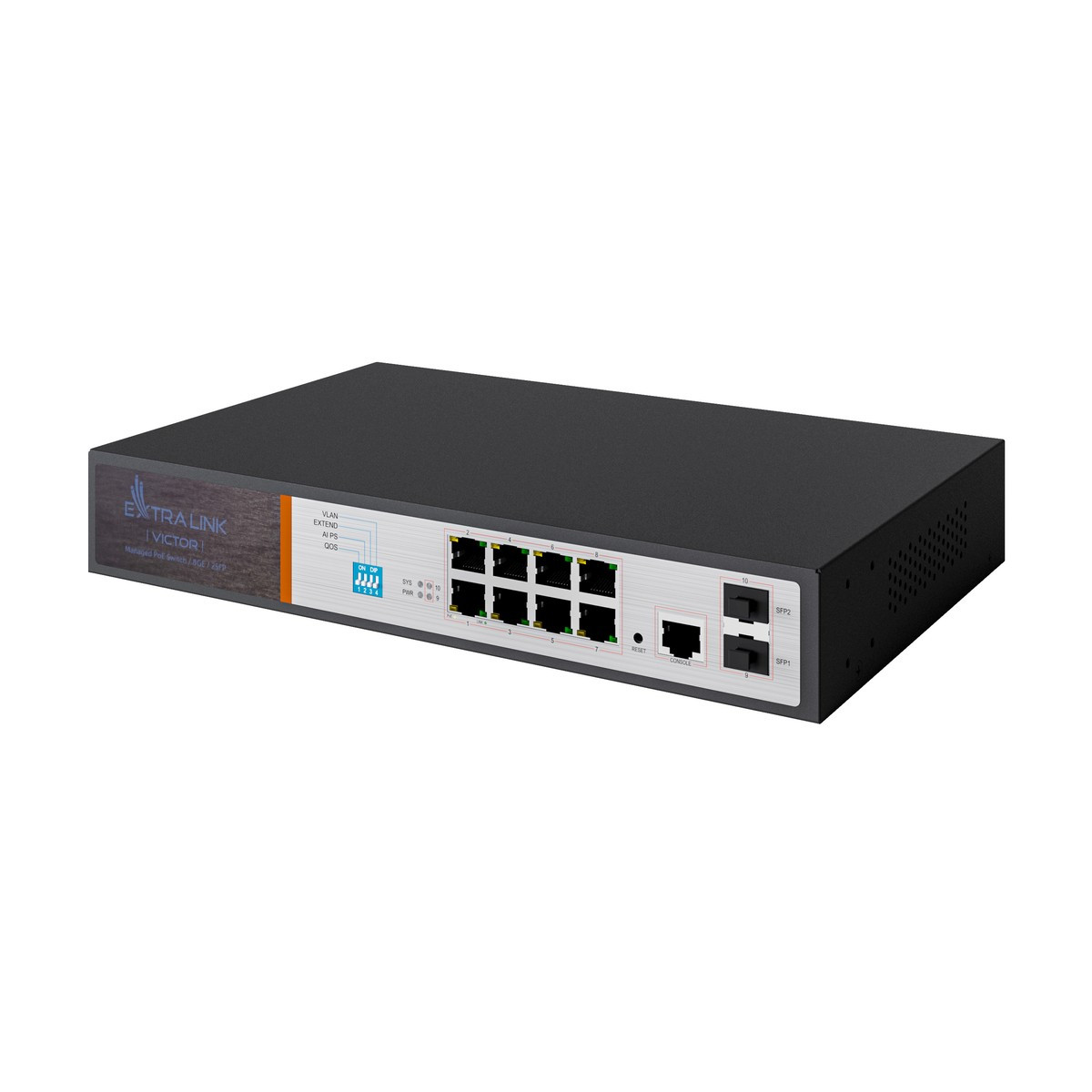 Extralink VICTOR | PoE Switch | 8x Gigabit PoE/PoE+, 2x SFP, 1x Console Port, 150W, Managed