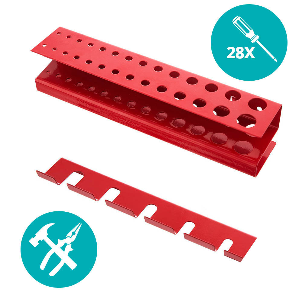 A panel tartalmazza: - 2 db villáskulcs tartó, melybe 8 db villáskulcs helyezhető el- 1 db csavarhúzó tartó 28 db csavarhúzónak- 4 db nagy szerszám akasztó- 2 db kisebb szerszám akasztó 5 db szerszámhoz