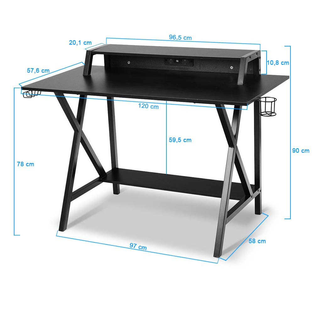 Műszaki adatok:Teljes méret: 134 × 58 × 90 cmAsztallap mérete: 120 × 57,6 cmAsztallap magassága: 78 cmFelső polc mérete: 96,5 × 20,1 cm (10,8 cm magasan az asztallaptól)Alsó tartó mérete: 91,3 × 20,1 cm (59,5 cm távolság az asztallaptól)Bemeneti feszültség: 220-250V~50/60HzUSB kimenet: 5,1V 2,1AKizárólag beltéri használatra!