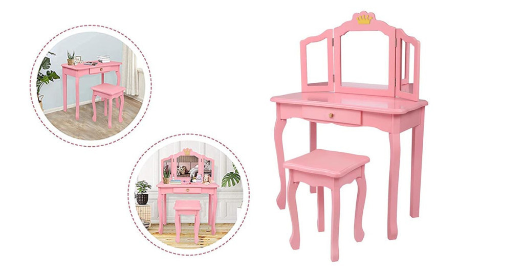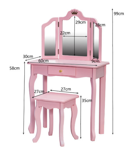 Ez a klasszikus dizájnú, festett fa fésülködő asztal tökéletes játék minden kislány számára, aki hercegnőnek szeretné érezni magát. Behajtható tükrökkel, arany koronával és saját kis székkel felszerelve igazi álombútordarab, mely órákra leköti a gyerekeket szépítkezés és szerepjáték közben.