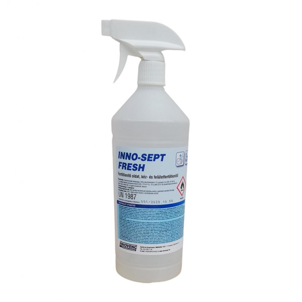 - fertőtlenítő oldat- antimikrobiális spektrum: baktericid (MRSA), yeasticid, tuberkulocid, szelektív virucid (burkos vírusokra)- alkalmazási feltételek: töményen kell alkalmazniFelhasználható a közegészségügy, az élelmiszeripar, a vendéglátás valamint a szolgáltató ipar különböző területein foglalkozásszerű felhasználók részére. Felhasználásra kész folyadék (terméktípus PT1, PT2, PT4).Higiénés kézfertőtlenítés: Juttassunk a tenyérbe kb. 3 ml INNO-SEPT FRESH fertőtlenítő oldatot, majd alaposan dörzsöljük be a keveréket 30 másodpercig és hagyjuk megszáradni. A tuberkulocid hatékonyság elérésére 1 perc behatási idő szükséges.Felületfertőtlenítés: Permetezze a keveréket a felületre, vagy a fertőtlenítőszerrel átitatott törlőkendővel kezelje a felületet úgy, hogy a fertőtlenítőszer a felületet teljesen benedvesítse és kezeletlen részek ne maradjanak. Minimális behatási idő: 5 perc.A behatási idő letelte után a szer maradványait a kezelt felületről– a padozat kivételével- alapos ivóvizes öblítéssel kell eltávolítani. Az élelmiszerekkel közvetlenül érintkező felületek esetében az öblítés hatékonyságát ellenőrizni kell. Erősen szennyezett kéz vagy felület esetén egy erősebb tisztító hatással rendelkező szerrel történő kézmosás (MANUELA), illetve felülettisztítás (INNOFLUID-ALK-M) után használjuk fertőtlenítésre a szert.