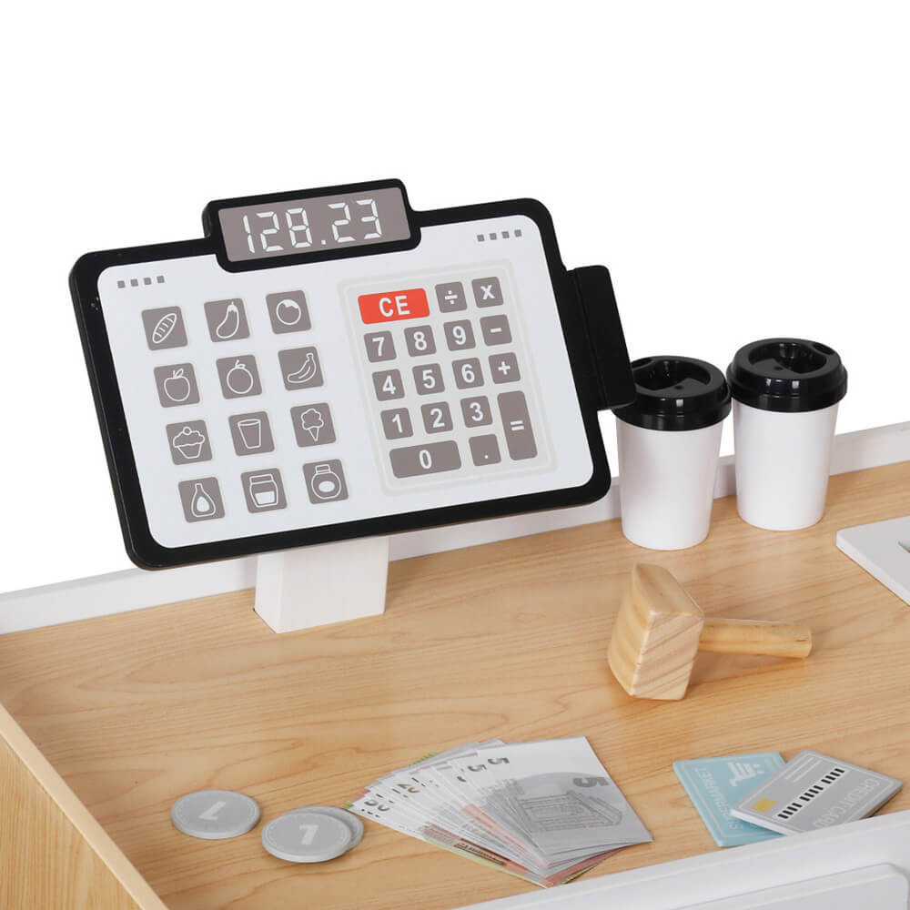 Ebben a részletesen kidolgozott fa játék szupermarketben a gyerekek valódi boltost játszhatnak: rendezhetik a polcokat, lemérhetik az árut, kezelhetik a pénztárgépet, vagy kiszolgálhatják a vevőket. A hétköznapi helyzetek eljátszása örömteli élménnyé válik a natúr fa elemekkel.