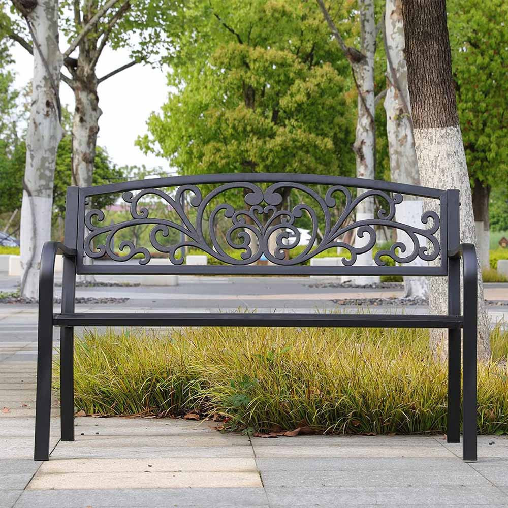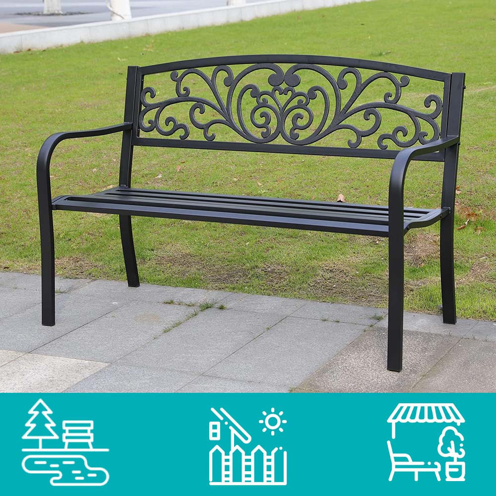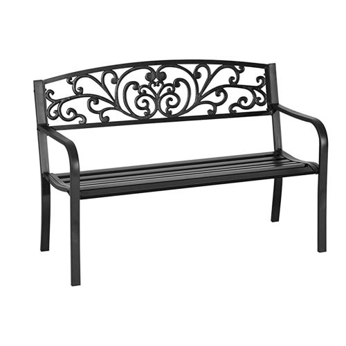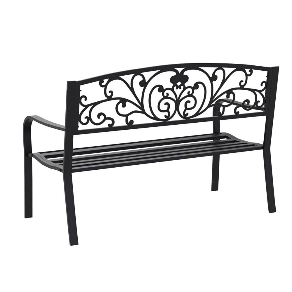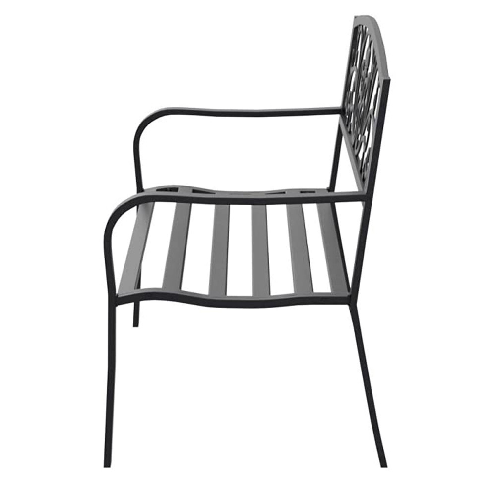 Ez az elegáns kültéri fém kerti pad ideális választás teraszra vagy kertbe. Strapabíró szerkezete két személy számára is kényelmes pihenést biztosít. Klasszikus fekete színe bármely kültéri enteriőrbe illik, időtálló és dekoratív darab, akár minden évszakban.