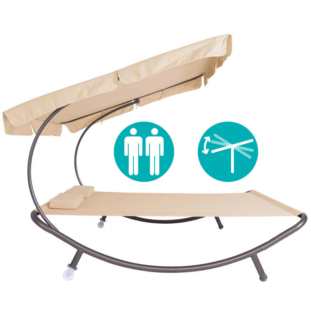 Ez a kétszemélyes kerti ágy kiváló választás, ha pároddal együtt pihennél a friss levegőn. Dönthető árnyékolója véd a naptól, kerekei révén könnyen mozgatható, a mellékelt párnák pedig még kényelmesebbé teszik a pihenést. Ideális nagyobb teraszokra vagy kertekbe.