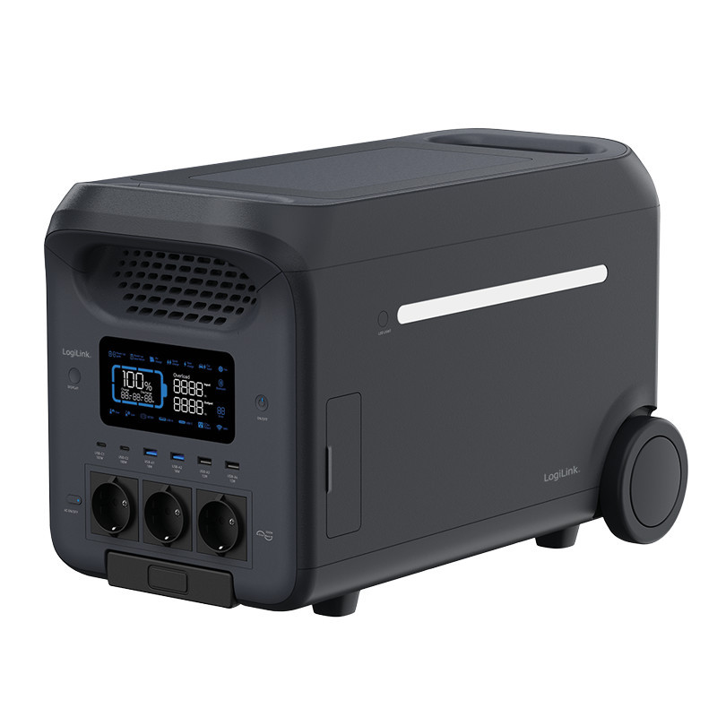 Megbízható és stabil energiamegoldás LiFePO4 akkumulátorral és kiegészítő akkumulátorcsatlakozással Tápellátás 13 készülékhez, akár 2560 Wh-val A tökéletes vészhelyzeti tápegység bel- és kültérre 3x AC, 4x USB-A, 2x USB-C, 1x Anderson terminál, 2x DC5521 és 1x autós töltőporttal felszerelve Bemenetek: 1x AC 220 240 V/10 A, 50/60 Hz (max. 2300 W), 1x napelem: 13 45 V/12 A (max. 800 W), 1x autós töltőcsatlakozás: 12/24 V, DC 8 A, 1x csatlakozás az akkumulátor bővítéséhez Kimenetek: 2x USB-A: (QC) 5 V/3 A, 9 V/2 A, 12 V/1,5 A (max. 18 W) / 2x USB-A: 5 V/2,4 A (max. 12 W), 2x USB-C: 5, 9, 12, 15 V/3 A, 20 V/5 A (max. 100 W), 2x DC5521: 12,6 V/3 A, Auto: 12,6 V/10 A (max. 126 W) Eszközvédelem: Túlmelegedés, alacsony hőmérséklet, túlkisülés, túltöltés, túlterhelés, rövidzárlat és túláram elleni védelem Tartozékok: 1x AC kábel, 1x autó töltőkábel Méretek: 53.6 x 30.3 x 34.3 cm Súly: 34 kg Szín: Fekete Gyártó: Logilink