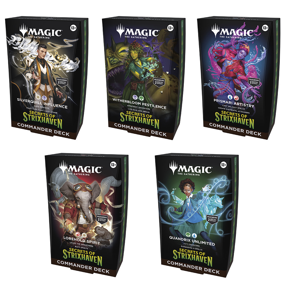 Prismari ArtistryLet your creativity run wild with Rootha as your artist-in-residence and cast expensive, bombastic spells. Bigger spells let you generate bigger Elementals poised to attack, so pull out all the stops and go for broke!Witherbloom PestilenceThere's trouble brewing when Dina leads your Witherbloom forces, so prepare the Pests for sacrifice! Sacrifices grant life, cards, and stackable counters that prepare your next victim for gainful harvesting or pump your attackers for a deadly push.Lorehold SpiritSet out on a Lorehold expedition with Quintorius and planeswalk a lethal path across the table. Create Spirits when cards leave your graveyard, then pile on typal Spirit bonuses and buffs to bury your opponents six feet deep!Quandrix UnlimitedIn Quandrix, when solving for X, the solution is clear—bigger is better! Calculate victory with Zimone using Fractals, Hydras, and other variable creatures to swarm the battlefield with powers so profound your opponents will be absolutely perplexed.