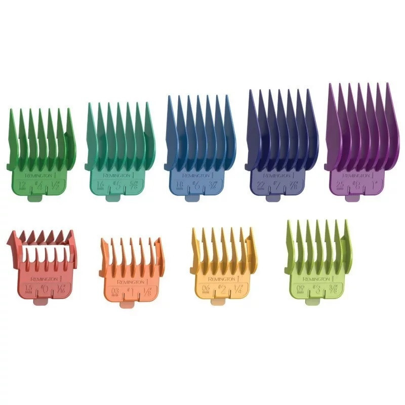 Színkódos vezetőfésűk. Ez a 16 darabos készlet 8 színes vezetőfésűt tartalmaz, ami megkönnyíti a vezetőfésű kiválasztását. Elmúltak már azok a napok, amikor a sok, szinte egyforma kinézetű fekete vezetőfésű közül időbe telt megtalálni a megfelelő hosszúságú darabot. Ha rendszeresen ugyanazt a fokozatot választod, akkor egyszerűen csak a színére kell emlékezned a következő alkalommal!