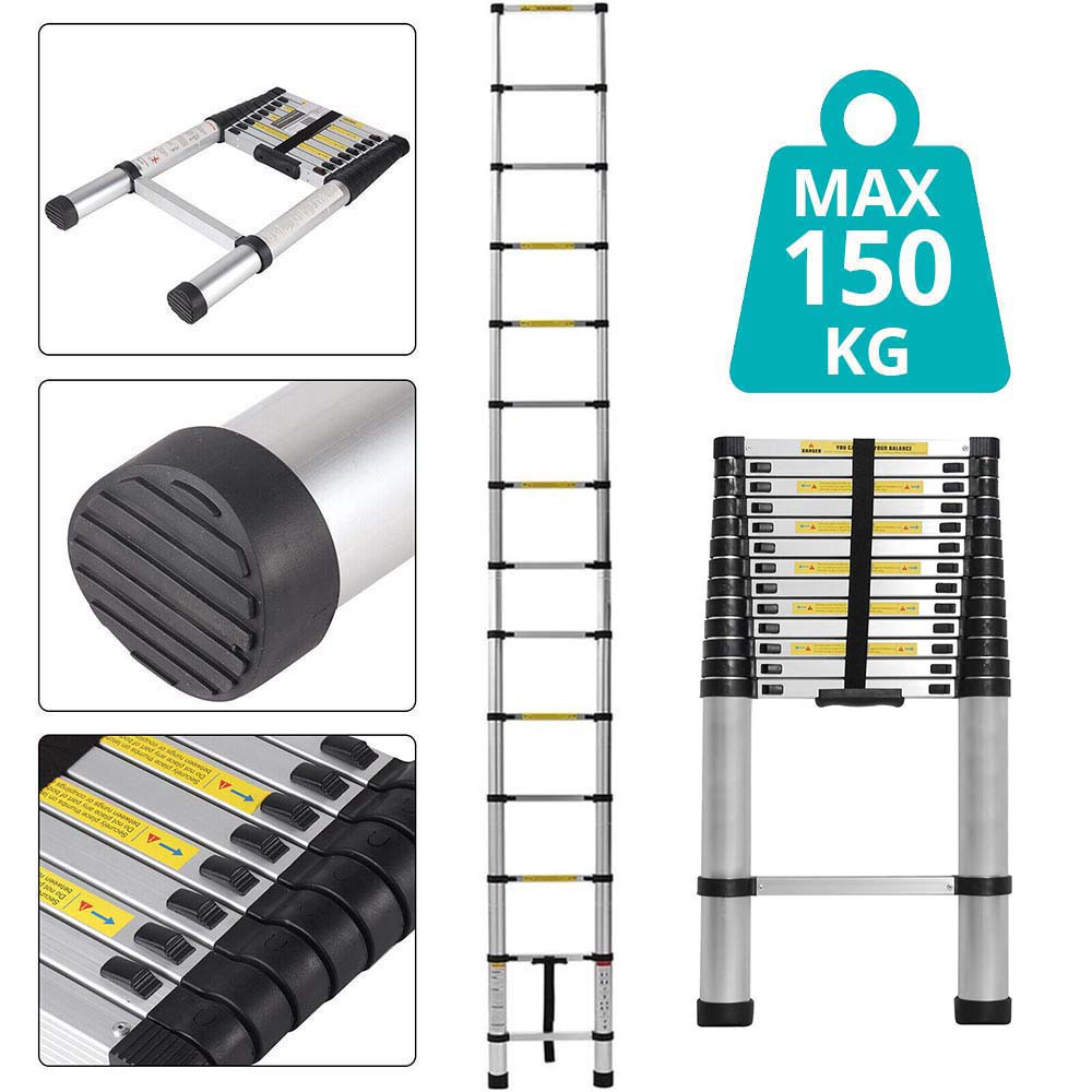 Ez a kihúzható teleszkópos létra ideális megoldás háztartási és szakmai feladatokra is. Kis helyen is elfér, mégis akár 150 kg-ot is elbír, fokozatosan állítható magassággal és csúszásgátlós talppal biztosítva a stabilitást és biztonságot.