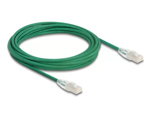 A Delock hálózati kábellel különböző hálózati eszközök kapcsolhatók össze pl. egy hálózati vezérlő egy switch-hez vagy egy patch panelhez. Vékony patch kábel A vékony patch kábelek jellemezhetők alacsony kábel átmérőjükkel és a hálózati kabinetben általuk megvalósítható flexibilis és helytakarékos összeköttetésekkel. Hajlított kilinccsel Az RJ45 csatlakozó hajlított kilinccsel lett kialakítva hogy teret adjon mikor a csatlakozót kihúzzuk és ilyenkor megsérülhetne. Műszaki adatok Csatlakozó: 1 x RJ45 dugó 1 x RJ45 dugó Cat.6A specifikáció Akár 10 Gbps sebességű adatátvitel Sávszélesség: 500 MHz Árnyékolt (U/FTP) RJ45 csatlakozó hajlított kilinccsel Vékony Kábel vastagsága: 28 AWG Arany bevonatú érintkezők: 50 u Kábelátmérő: kb. 4,9 mm Kábelborítás anyaga: LSZH Szín: zöld Hosszúság: kb. 5 m Rendszerkövetelmények Egy szabad RJ45-csatlakozóhüvely A csomag tartalma RJ45 kábel Csomag Zárható műanyag tasak Gyártó: Delock