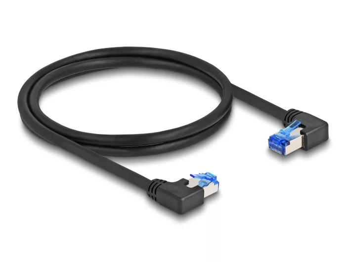 A Delock hálózati kábellel különböző hálózati eszközök kapcsolhatók össze pl. egy hálózati vezérlő egy switch-hez vagy egy patch panelhez. Hajlított csatlakozó fejjel A szögletes csatlakozó lehetővé teszi a helytakarékos telepítést szűk helyeken a készülékek vagy a hálózati szekrények mögött. Műszaki adatok Csatlakozó: 1 x RJ45 apa jobbra hajlítva 1 x RJ45 apa balra hajlítva 1:1 csatlakoztatás Cat.6A specifikáció Akár 10 Gbps sebességű adatátvitel Sávszélesség: 500 MHz Árnyékolt (S/FTP) Hajlékony Kábel vastagsága: 26 AWG Arany bevonatú érintkezők: 50 u Kábelátmérő: kb. 6,0 mm Kábelborítás anyaga: LSZH (halogénmentes) Szín: fekete Hosszúság: kb. 1 m A csomag tartalma Patch kábel Csomag Zárható műanyag tasak Gyártó: Delock