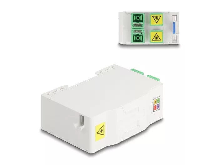 Ez a Delock FTTH optikai szál csatlakoztató doboz ideális beltéri optikai szál rendszer gyors és biztonságos felállítására. Be tud fogadni akár négy SC Simplex vagy LC Duplex couplert. Csatlakozó doboz DIN sín beszereléséhez A beépített kapcsok lehetővé teszik a 35 mm-es DIN sínekre rögzítést. Toldó tartóval A beépített toldó tartó lehetővé teszi az egyéni szálak tiszta elrendezését és a könnyű hullámú jelek optimális átadását. Műszaki adatok Optikai rostkapcsoló doboz FTTH alkalmazásokhoz Csatlakozó doboz 4 x SC Simplex kapcsolóval 4 bemenet SC Simplex vagy LC Duplex kötésekhez DIN sín rögzítés: 35 mm Toldó tartóval Védő pattintás Borítás szín: fehér Burkolat anyaga: ABS Méretek (HxSzxM): kb. 85,0 x 60,6 x 31,5 mm A csomag tartalma Optikai rostkapcsoló doboz 4 x SC Simplex párosító 4 x hőre zsugorodó kötésvédelem Csomag White Box Gyártó: Delock