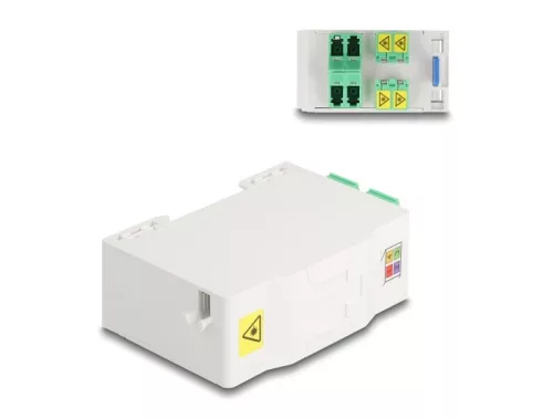 Ez a Delock FTTH optikai szál csatlakoztató doboz ideális beltéri optikai szál rendszer gyors és biztonságos felállítására. Be tud fogadni akár négy SC Simplex vagy LC Duplex couplert. Csatlakozó doboz DIN sín beszereléséhez A beépített kapcsok lehetővé teszik a 35 mm-es DIN sínekre rögzítést. Toldó tartóval A beépített toldó tartó lehetővé teszi az egyéni szálak tiszta elrendezését és a könnyű hullámú jelek optimális átadását. Műszaki adatok Optikai rostkapcsoló doboz FTTH alkalmazásokhoz Csatlakozó doboz 4 x LC Duplex kapcsolóval 4 bemenet SC Simplex vagy LC Duplex kötésekhez DIN sín rögzítés: 35 mm Toldó tartóval Védő pattintás Borítás szín: fehér Burkolat anyaga: ABS Méretek (HxSzxM): kb. 85,0 x 60,6 x 31,5 mm A csomag tartalma Optikai rostkapcsoló doboz 4 x LC Duplex párosító 8 x hőre zsugorodó kötésvédelem Csomag White Box Gyártó: Delock