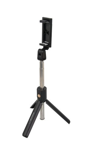 A high-quality monopod with a tripod function, made of stainless steel, featuring a compact and portable design. It has three foldable legs that provide stability and allow for taking photos from a greater distance. The set includes a portable remote control (hidden in the monopod handle), enabling remote photo capturing. Compatible with smartphones and tablets running iOS (version 6.0 or later) or Android (version 4.2 or later).