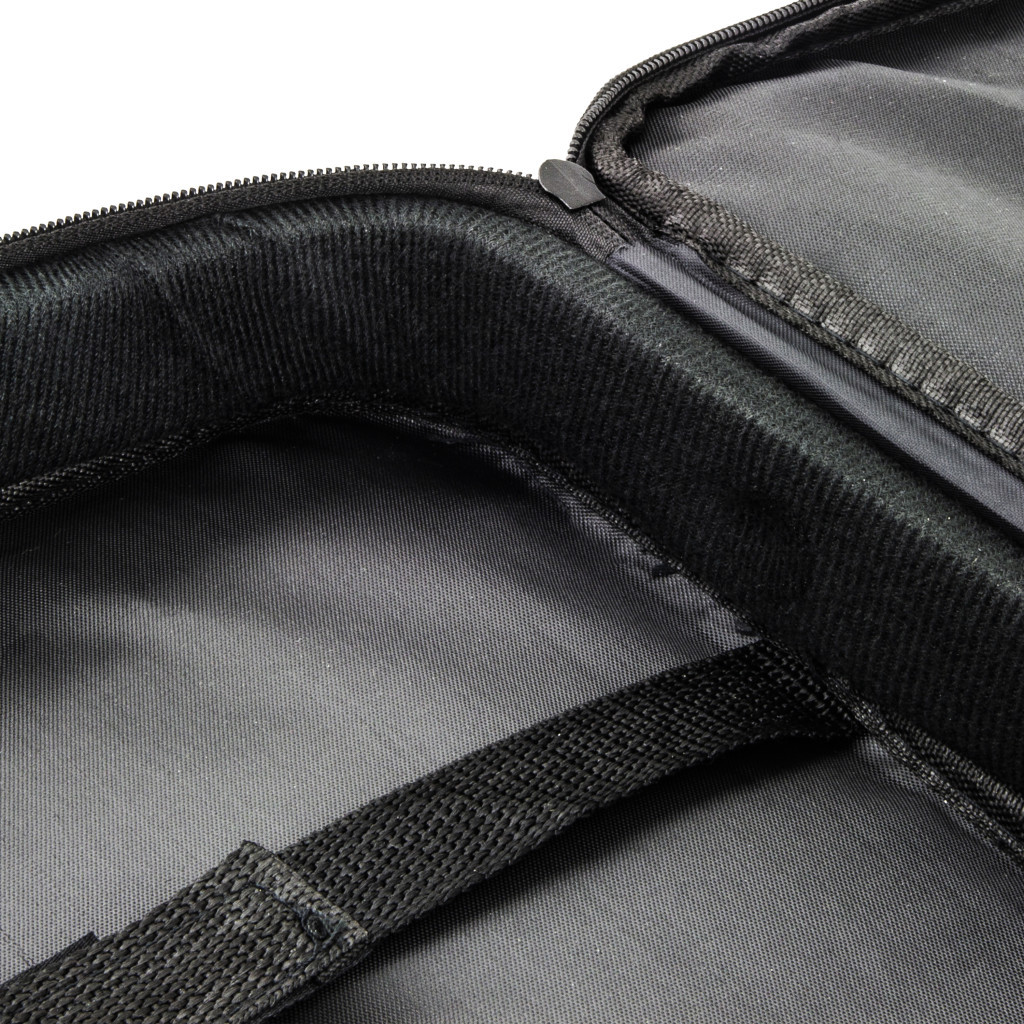 Elegant notebook bag designed for laptops with a maximum screen size of 15.6". The internal compartment size can be adjusted using a sliding panel with Velcro fasteners, allowing the compartment to fit various notebook dimensions perfectly. The bag is crafted from high-quality materials, with side walls reinforced by a metal frame and lined internally with a soft foam layer to effectively protect the notebook from impacts and scratches. The notebook compartment is cushioned on all sides with soft materials for added safety. Externally, the front of the bag features a practical pocket suitable for documents or other items. Inside, there is an additional pocket and a strap to securely hold the notebook. The metal hinges for the handle and shoulder strap ensure durability and reliability. The adjustable shoulder strap is attached with practical metal carabiners and features a rubber pad in its middle section for added carrying comfort.