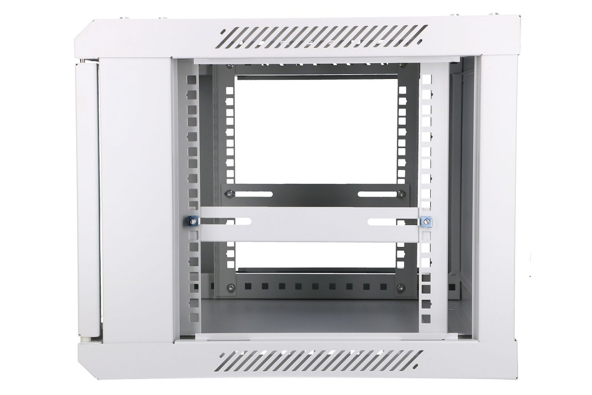 Extralink's rack cabinet is designed for wall mounting in offices, network server rooms and CCTV control rooms. The outer walls are made of cold-rolled steel sheet. Equipped with a pane of tempered glass, the front door can open to the left or right side.