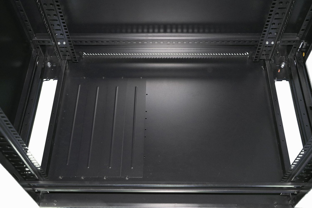 On the ceiling of the cabinet there are 4 spaces for installing fans for better cooling of the devices, as well as additional conduit for pulling out cables.