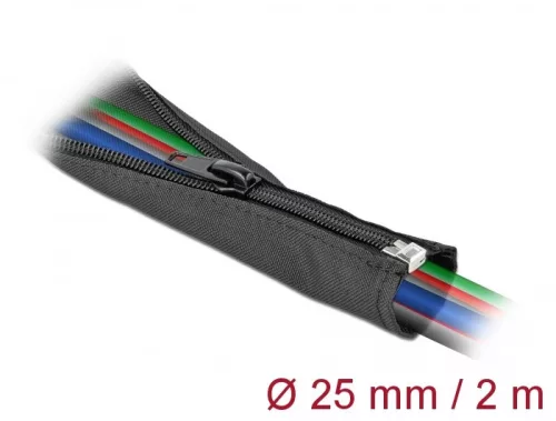 Ez a Delock szőtt karmantyú szabadon lévő kábelek összefogására valamint elektromos csövek és vezetékek kosz és károsodás elleni védelmére használható. Speciális és folyamatos (többágú fonal) rostanyagból készült és így károsodás- és tűzvédelmet biztosít. Beépített zipzáras szorítóval Az egyszerű és könnyen kezelhető zipzáras szorítónak köszönhetően, a kábelek számos alkalommal hozzáadhatók és elvehetők. Műszaki adatok Hosszúság: kb. 2 m Átmérő: kb. 25 mm Összekapcsolódás átmérője: max. 27 mm Környezeti hőmérséklet: -50 C ~ 150 C Újrahasználható Anyag: poliészter többágú fonal Tűzállósági besorolás: VW-1 Szín: fekete A csomag tartalma Szőtt karmantyú (hüvely) Csomag Zárható műanyag tasak Gyártó: Delock