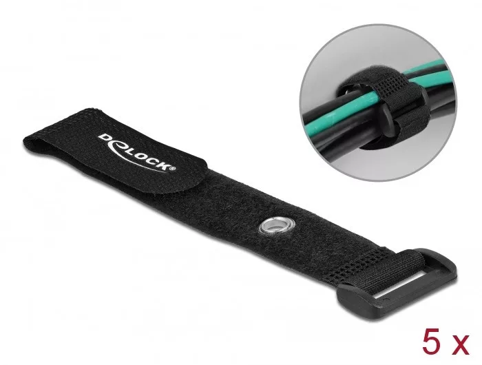 Delock Befűzős kábelkötegelő tépőzárral és szorító karikával hossza 190 mm, szélessége 25 mm, 5 db.