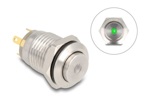 Ez a Delock nyomógomb ideális kontrollpanelbe történő beszereléshez, például iőari felhasználásra kontroll vagy szabályozó technológiai eszköz esetén. Nyomó gombokat használnak még az autóiparban vagy felhasználó szektorban. Például kapucsengőként vagy a világítási rendszer kapcsolójaként időzítőkkel, melyeket például folyosókon is alkalmaznak. Gomb Egy úgy nevezett gomb, vagy nyomógomb visszatér eredeti állapotába/helyzetébe megnyomás után. Nyitó és záró A NO (záró) kapcsoló létrehoz érintkezést két kapcsolat között, míg az NC (nyitó) kapcsoló szétengedi azokat. Műszaki adatok Csatlakozó: 4 x forrasztott csatlakozás Kapcsoló típus: 1NO + 1 NC Kapcsoló feszültség: AC 230 V~ / 3 A Kontaktok száma: 4 Nyílt kontaktok száma: 1 Funkció: időszakos Működtető: magas Működési hőmérséklet: -25 C ~ 55 C Rögzítési furatátmérő: 12 mm Hatlaú csavarkulcs szélessége: 14 mm Szerelési mélység: kb. 18 mm Csavarmenet méret: M12 LED fény: zöld LED volt érték: 12 V LED típusa: pont Anyag: nikkelezett rozsdamentes acél Mechanikus élettartam: 1.000.000 ciklus Elektromos szolgáltatás élettartama: 100 000 kör Védelmi besorolás: IP65 Méretek (H x M): kb. 23 x 14 mm Csomag Retail Box Gyártó: Delock