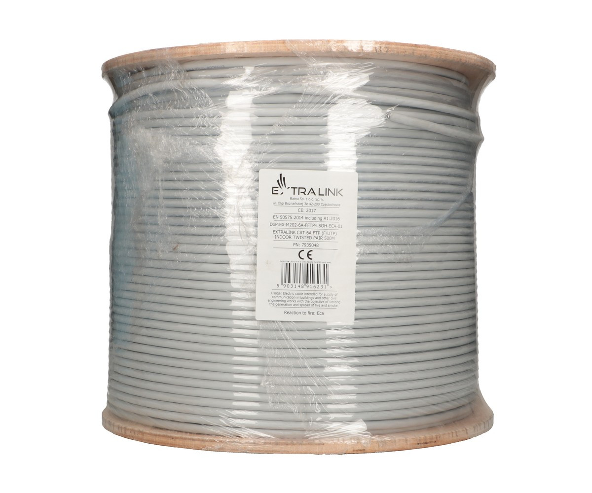 Extralink Cat. 6A FTP is a high quality network cable for indoor installation. Category 6a includes cabling that requires a 500 MHz band and data transmission up to 10 Gb/s (10 Gigabit Ethernet). The cable construction consists of 4 pairs of cables twisted together to eliminate electromagnetic interference. The cables are made of pure copper with a thickness of 23 AWG with HDPE sheath. Every pair is separately shielded with aluminium foil and additionally one common shielding for all cables. The whole is covered with a combustion safe Low Smoke Zero Halogen (LSZH) coating, in accordance with the requirements of the fire safety regulations for large commercial buildings.The package contains 500 m of cable.