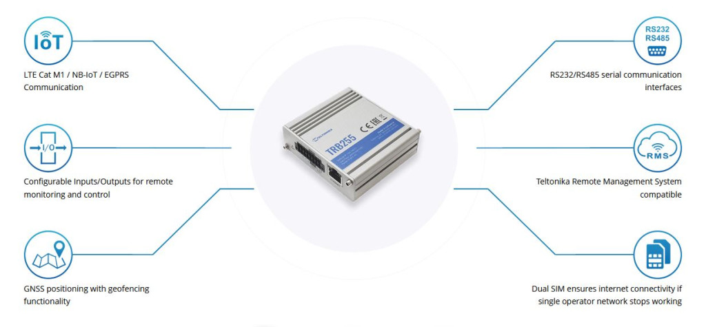 The Teltonika TRB255 network gateway offers a cost-effective and scalable way to upgrade large amounts of legacy infrastructure or implement new M2M interoperability projects using support for various cellular standards. In addition, built-in GNSS, dual SIM cards and compatibility with Teltonika's remote control system enable not only reliable infrastructure connectivity, but also easy monitoring and management.