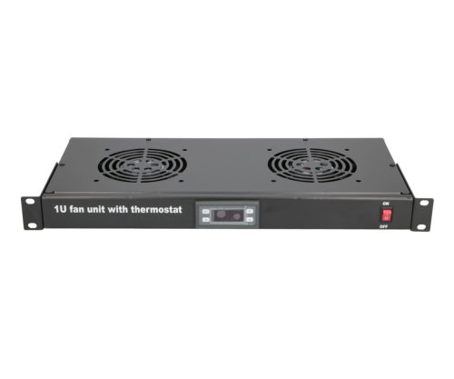 The ventilation panel includes 2 fans, temperature sensor with 1.8m cable, 1.7m power cable, digital indicator of current temperature. The presented product is designed for 19" cabinets. The front panel has a thermostat display and buttons for setting the temperature.