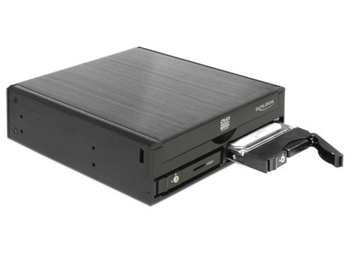 Ezt a Delock mobil beépítő keretet (mobil rack) a számítógépház egy szabad, 5.25” meghajtó helyébe lehet beszerelni. A kerethez egy keskeny (slim) kivitelű meghajtó és két 2.5”-os SATA merevlemez is rögzíthető. A “hot plug” funkció lehetővé teszi a merevlemez-meghajtó működés közbeni cseréjét.