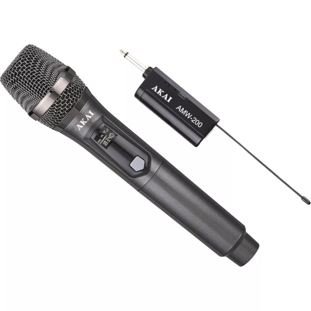 Kardioid vezeték nélküli mikrofon digitális hangátvitellel Műszaki adatok Digitális hangátviteli technológia; Egyedi digitális 32 bites ID pilot technológia, amely elkerüli az interferenciát még ugyanazon a frekvencián is; Ultrarövid hangkésleltetés; Hangmintavételi mód: 48 kHz; Frekvenciaátvitel: 50 Hz-18 kHz; Ideális távolság: 20-30 méter (nyílt helyen) Mikrofon típusa: Dinamikus Polaritásminta: Kardioid Frekvenciatartomány: VHF 174~216MHz Hangkódoló típusa: Digitális 16 bites azonosítókódos pilottechnológia FR kimeneti teljesítmény: 10 mW Audio dinamikatartomány: 96 dB Harmonikus sugárzás <-50 dB Torzítás: <0,1% Tápellátás: 18650 lítium akkumulátor 3,7 V, 1 db-os csomag Frekvenciatartomány: VHF 174~216 MHz Hangkódoló típusa: Digitális 16 bites azonosítókódos pilottechnológia Jel/zaj arány: 96 dB Vételi válasz: 50 Hz~18 kHz Torzítás: 0,05% Audio dinamikatartomány: 96 dB Átviteli késleltetés: 2,5 msGyártó: AKAI