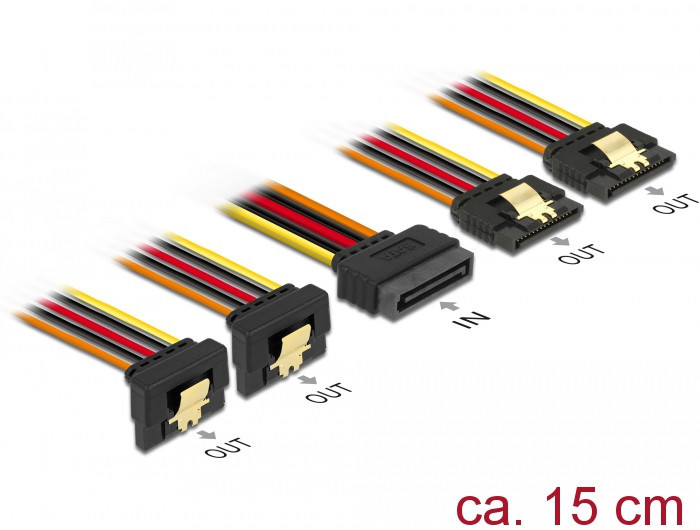 Ez a Delock kábel négy SATA eszköz energia ellátását biztosítja a tápegység egyik szabad 15 pin-es tápcsatlakozóján keresztül. A kimeneti csatlakozón lévő fém klipszek és a bemeneti csatlakozón lévő hézag biztosítja, hogy a kábel megbízhatóan kattanjon a helyére.