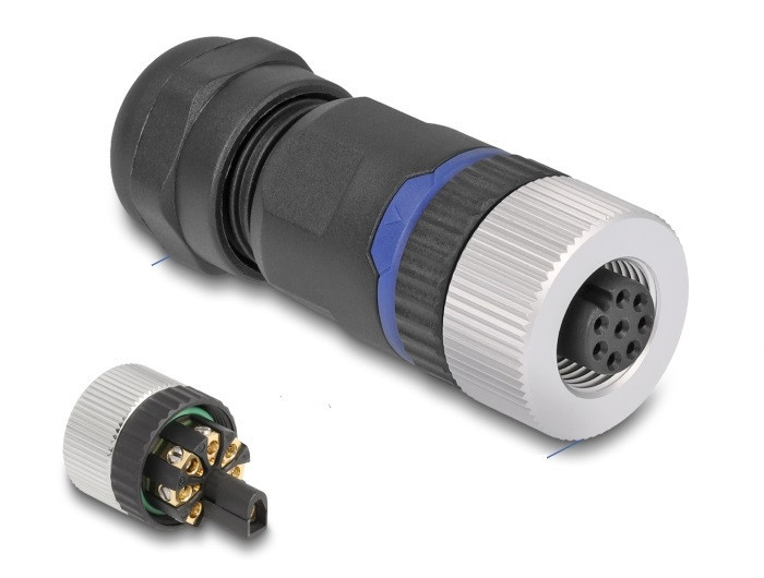 Ez a Delock csatlakozó használható egy kábel M12 konnektorhoz például gépellenőrzés vagy automatizációkor kötéséhez egy csavaros terminál csatlakozó felületen keresztül. Műszaki adatok Csatlakozó: 1 x M12 anya A kódolt 8 tűs 8 x csavar alkalmas Kábelkapcsoló használható 26-20 AWG-ig (0,13 - 0,52 mm2) Működési feszültség: max. 30 V Árammennyiség: max. 2 A Működési hőmérséklet: -25 C ~ 85 C Védelmi besorolás: IP67 Kábel bemenet max. 3,0 - 8 mm Csavarmenet méret: M12 x 1,0 mm Burkolat anyaga: PA66 Szín: fekete Méretek (H x M): kb. 52 x 20 mm Rendszerkövetelmények Egy szabad M12-apa A csomag tartalma Csatlakozó Csomag Zárható műanyag tasak Gyártó: Delock