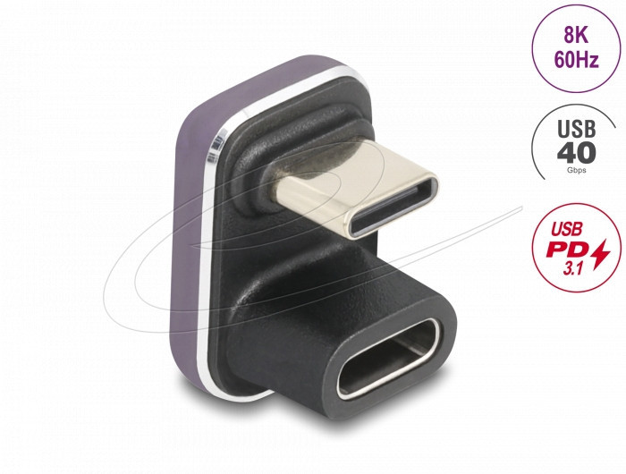 Delock USB-C adapter 180 -os szögben 40 Gb/s PD 3.1 240 W dugasz-alakú U-alakú 8K 60 Hz fém