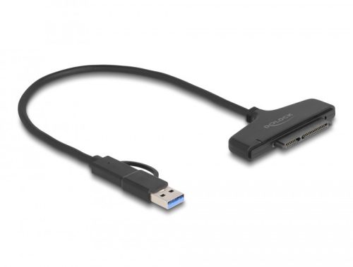 Ez a Delock átalakító USB-C vagy egy A-típusú USB csatolón keresztül asztali vagy hordozható számítógéphez csatlakoztatható. Ennek köszönhetően egy 2.5” SATA HDD vagy SSD használható egy 22 tűs SATA-csatolóval.