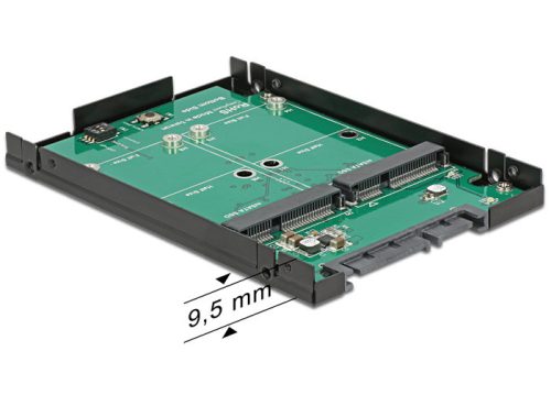 A Delock átalakítójával 2db mSATA SSD-t csatlakoztathat rendszeréhez, mint egy 2.5" méretű HDD-t. A rendszerhez egy belső, 22 pol. SATA csatlakozáson keresztül illesztheti. Különböző RAID beállításokat használhat 2db SSD használata esetén. Műszaki adatok - Csatlakozók: 1db 22 pol. 6Gbs SATA dugó, 2db mSATA foglalat (teljes méret). - Chipset: Asmedia ASM1092R - 2.5" formátum. - Használható 2db 3.3V-s mSATA memóriával. - Fél méretű modulok támogatása. - RAID: 0, 1, JBOD - RAID üzemmód a panelon lévő DIP-kapcsolóval állítható. - 2db LED: zöld SATA host aktivitás, piros M.2 SSD hiba - Operációs rendszer független működés, a működéshez nem szükséges driver telepítése. Rendszerkövetelmények: - Szabad 22 pol. SATA interface Csomag tartalma: - Delock átalakító - 2.5" ház - Szerelési tartozékok Csomagolás: - Doboz Gyártó: Delock Szélesség cm: 11,5 Hosszúság cm: 14,5 Magasság cm: 4