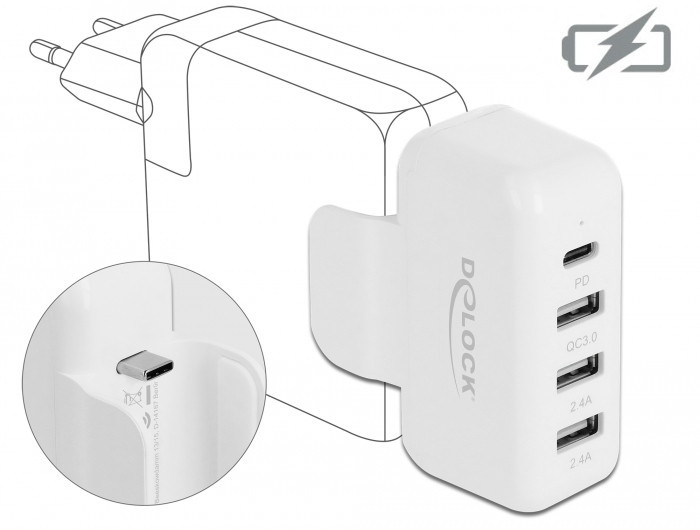 Ez a Delock átalakító összeköthető egy Apple tápcsatlakozóval, például egy MacBook Pro-val, és az kiterjeszti a tápcsatlakozót plusz négy töltő porttal. Így számos USB eszköz tölthető egyszerre. Biztos csatlakozás a tápcsatlakozóhoz A USB Type-C csatlakozásnak és az oldalsó kapcsoknak köszönhetően, a tápcsatlakozó biztosan kapcsolatot nyújt. PD és QC 3.0 A tápcsatlakozóhoz történő kapcsolódás után, négy USB töltő felület elérhető: egy USB Type-C anya PD funkcióval, egy Quick Charge 3.0 A-típusú USB anya és két A-típusú USB BC1.2 anya. Megjegyzés Amennyiben a PD és a QC portot egyszerre használja, csak 5 V elérhető a QC porton. Műszaki adatok Csatlakozó: 1 x USB Type-C dugó 1 x USB Type-C tápfeszültség-csatlakozóhüvely 1 x USB A-típusú hüvely QC 3.0 2 x USB A-típusú hüvely - BC1.2 akkumulátortöltési specifikáció USB Power Delivery (PD) 3.0 Kimenet: USB Type-C Teljesítmény-Leadás (PD): 5 V / 3 A, 9 V / 3 A, / 12 V / 3 A, 15 V / 3 A, 20 V / 2,25 A USB A-Típusú Qualcomm Quick Charge 3.0: 3,6 ~ 6,5 V / 3 A, 6,5 ~ 9 V / 2 A, 9 V ~ 12 V / 1,5 A USB A-típusú csatlakozóhüvely, BC1.2 specifikáció, 5 V / 2,4 A Túlterhelés elleni védelem Túláram elleni védelem Túlmelegedés elleni védelem Rövidzár elleni védelem 1 x LED jelzőfény Szín: fehér Méretek (HxSzxM): kb. 74 x 59 x 34 mm Rendszerkövetelmények Apple 61 watt vagy 87 watt tápcsatlakozó USB-C anyával A csomag tartalma Adapter Használati utasítás Csomag Retail Box Gyártó: Delock