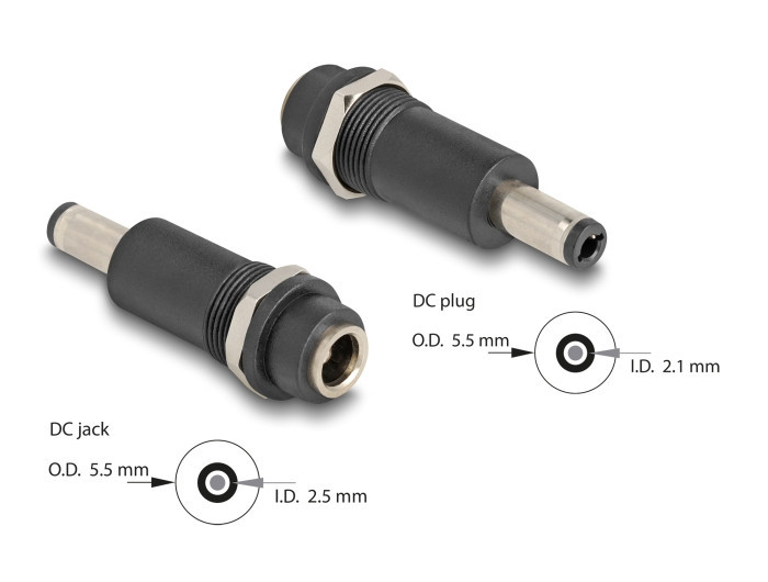 Ez a Delock DC adapter lehetővé teszi az eszközök tápellátását egy DC kapcsolattal. Megjegyzés A csatlakoztatott eszközök megfelelő funkciójának biztosításához a tápellátás feszültség, áram és polaritás specifikációjának illeszkednie kell. Műszaki adatok Csatlakozó: 1 x DC 5,5 x 2,5 mm-es hüvely 1 x DC 5,5 x 2,1 mm-es csatlakozódugó Szín: fekete Méretek (H x M): kb. 42,3 x 13,6 mm A csomag tartalma DC adapter Csomag Poly bag Gyártó: Delock