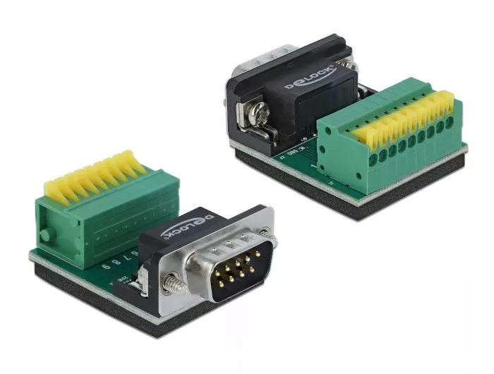 Ez a csatlakozóblokkal ellátott Delock adapter csupasz vezetékek csatlakoztatására használható. Az adapter nem csak speciális ipari célokra, hanem szabadidős tevékenységekhez (pl. vasúti modellezéshez) is megfelelő. Műszaki adatok Csatlakozó: 1 x soros Sub-D 9 dugó csavarokkal 1 x 9 tűs sorkapocs lenyomható gombbal Pólus kiosztás: 1:1 Vezetékek középvonala közötti távolság: 2,54 mm 26 20 AWG vezetékméretű kábelekhez használható Működési hőmérséklet: -20 C ~ 70 C Méretek (HxSzxM): kb. 36 x 31 x 17 mm Rendszerkövetelmények Egy szabad, 9 tűs Sub-D-csatlakozóhüvely A csomag tartalma Adapter Csomag Poly bag Gyártó: Delock